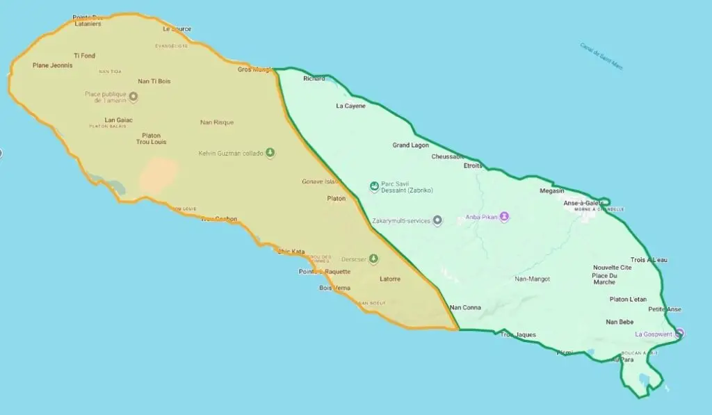 lans a rezen , Gran B, Lasous ak Grand vid , Boucan lotore zòn ki kote yo fe Festi Pwason . mòn li yo (Chen kontan , Lapye , Morikò , Danvil) yo ki reprezante yon sant pou peyi a nan sekte telekominikasyon , Zile a kapab zòn santral nan anpil sektè nan peyi a ex nan sekte maritim nan ki ka pemèt