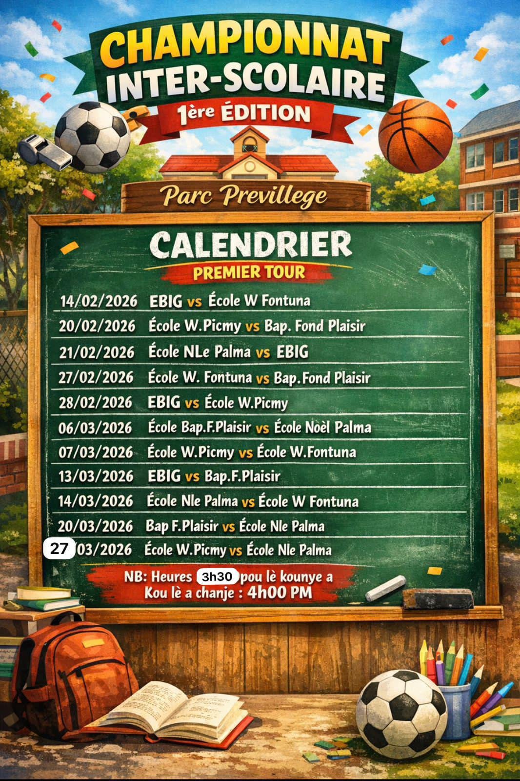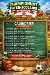 Pak previllege nan lakou Fonplezi pral resevwa premye chanpyona enstèskolè yo ki pral bay lekòl ki nan zon Sidès zile jwe antre yo e kontinye mete anbyans nan kad aktivite paraskolè yo ki enpotan anpil nan maryaj espò ak edikasyon si objetif yo kenbe .